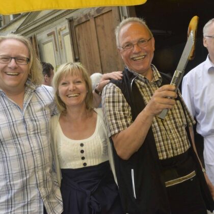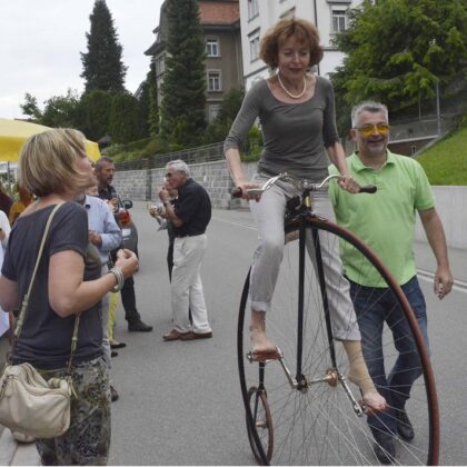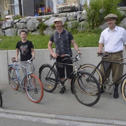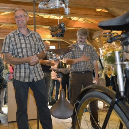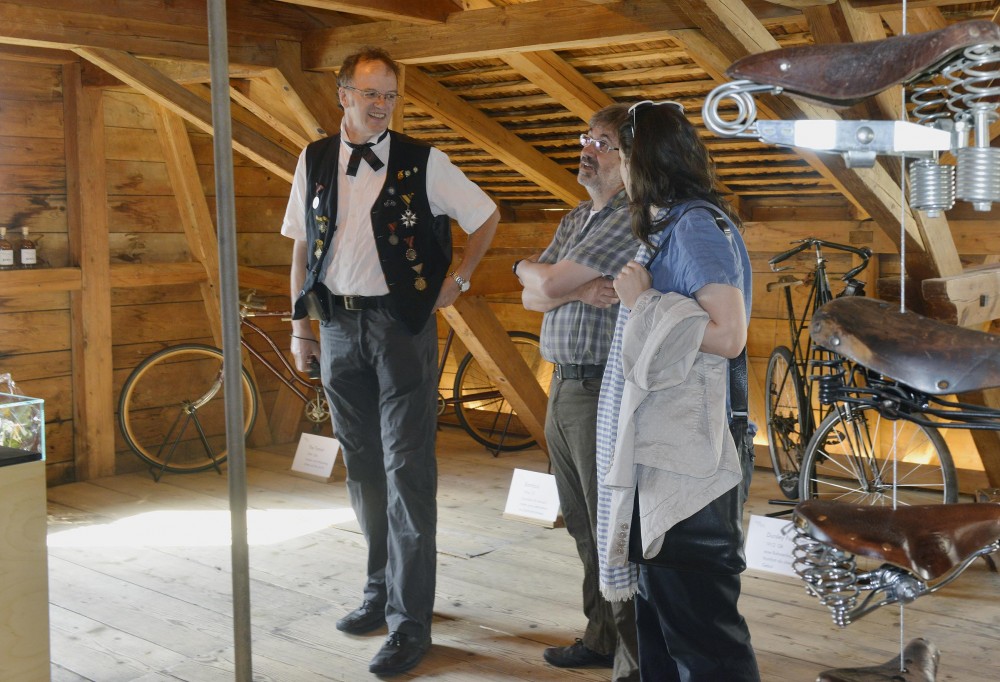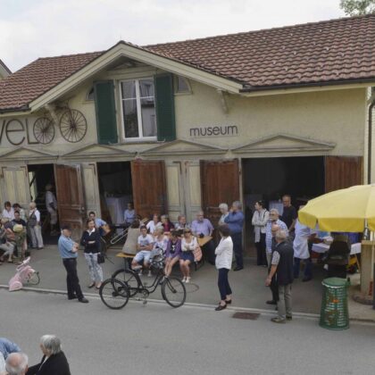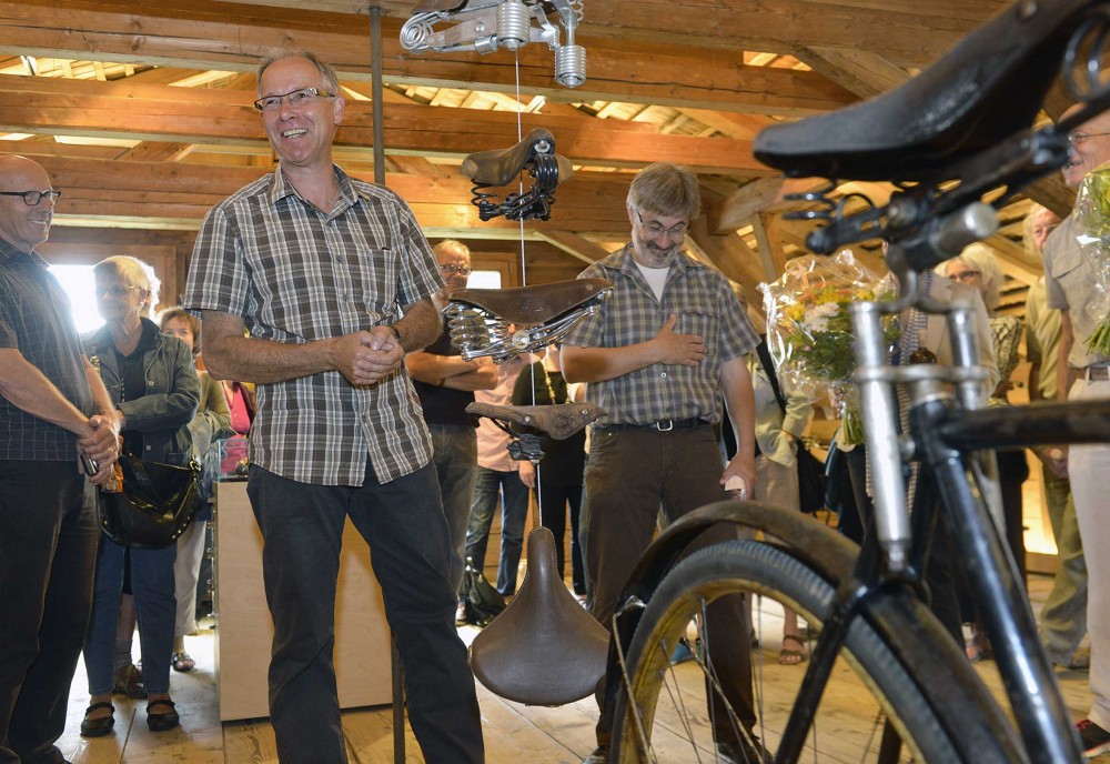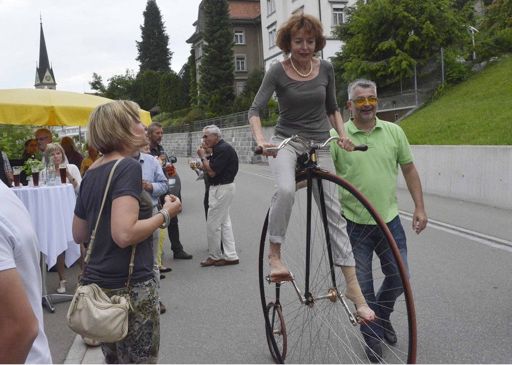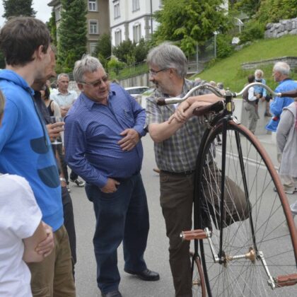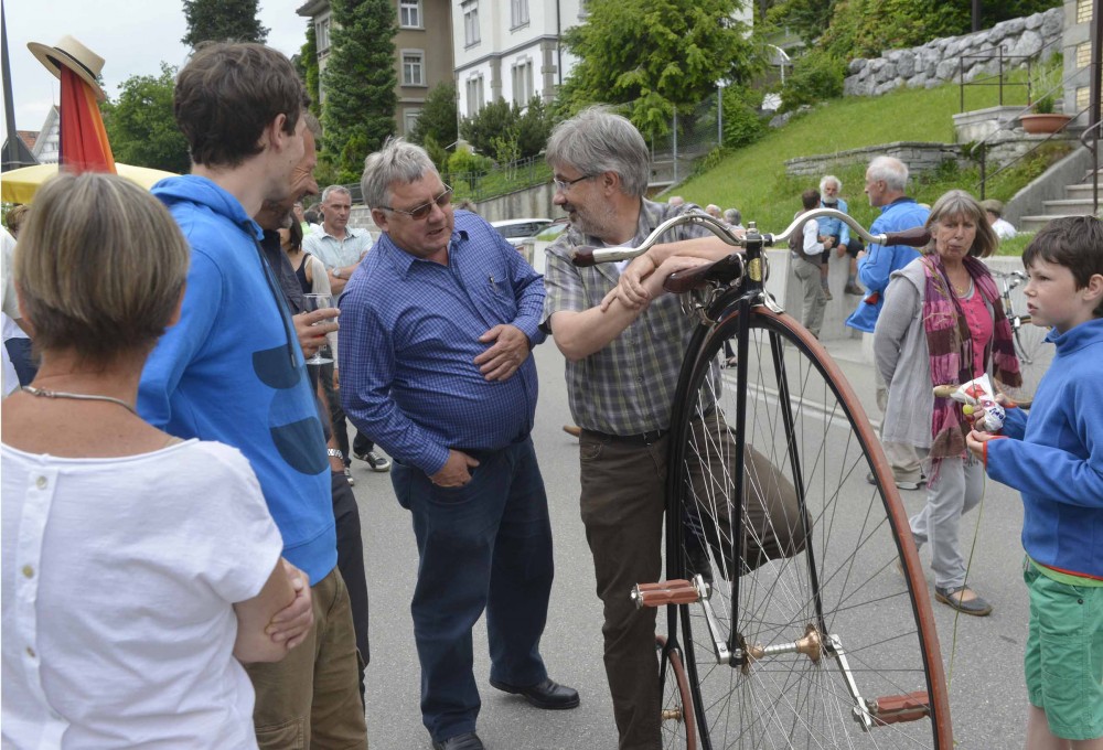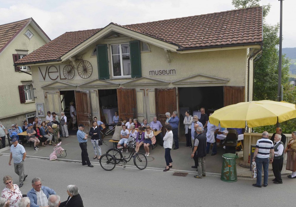 Für François Cauderay sei mit der Einweihung der Räumlichkeiten ein weiterer „Pflock„ in der Museumsgeschichte eingeschlagen, der ein unerwartet gutes Ende gefunden habe, sagt er. Beeindruckt zeigte sich der Museumsleiter ob der Tatsache, dass auch aus dem Ausland zahlreiche Gäste anwesend waren. Mit Verlagsleiterin Maxi Kutschera und dem Liebhaber alter Fahrräder, Helge Schultz, beide aus Leipzig, waren zwei „Schwergewichte“ der Deutschen Szene in Rehetobel anwesend und die Gruppe aus der deutschen Bodenseeregion um Georg Schmitz kam in passenden Outfit und Fahrrädern im ausserhodischen Dorf zum grossen Fest an. Für den Museumsleiter ist das die Anerkennung der Institution Velomuseum in der Veloszene. Auch die Gäste schätzen die Tatsache, dass die Situation um das Velomuseum, das aus Beständen einiger Sammler besteht, die ihren Besitz zusammenlegten und ein Museum gründeten, nahezu einmalig sei. Die Teamarbeit rund um das Rehetobler Velomuseum ist gut, es wird stets am „gleichen Strick gezogen“. – Ganz im Stile des Rehetobler Velomuseums kam übrigens im Anschluss an den festlichen Akt die Gemütlichkeit nicht zu kurz. Für experimentierfreudige Gäste stand auch ein Hochrad für eine Probefahrt zur Verfügung.
